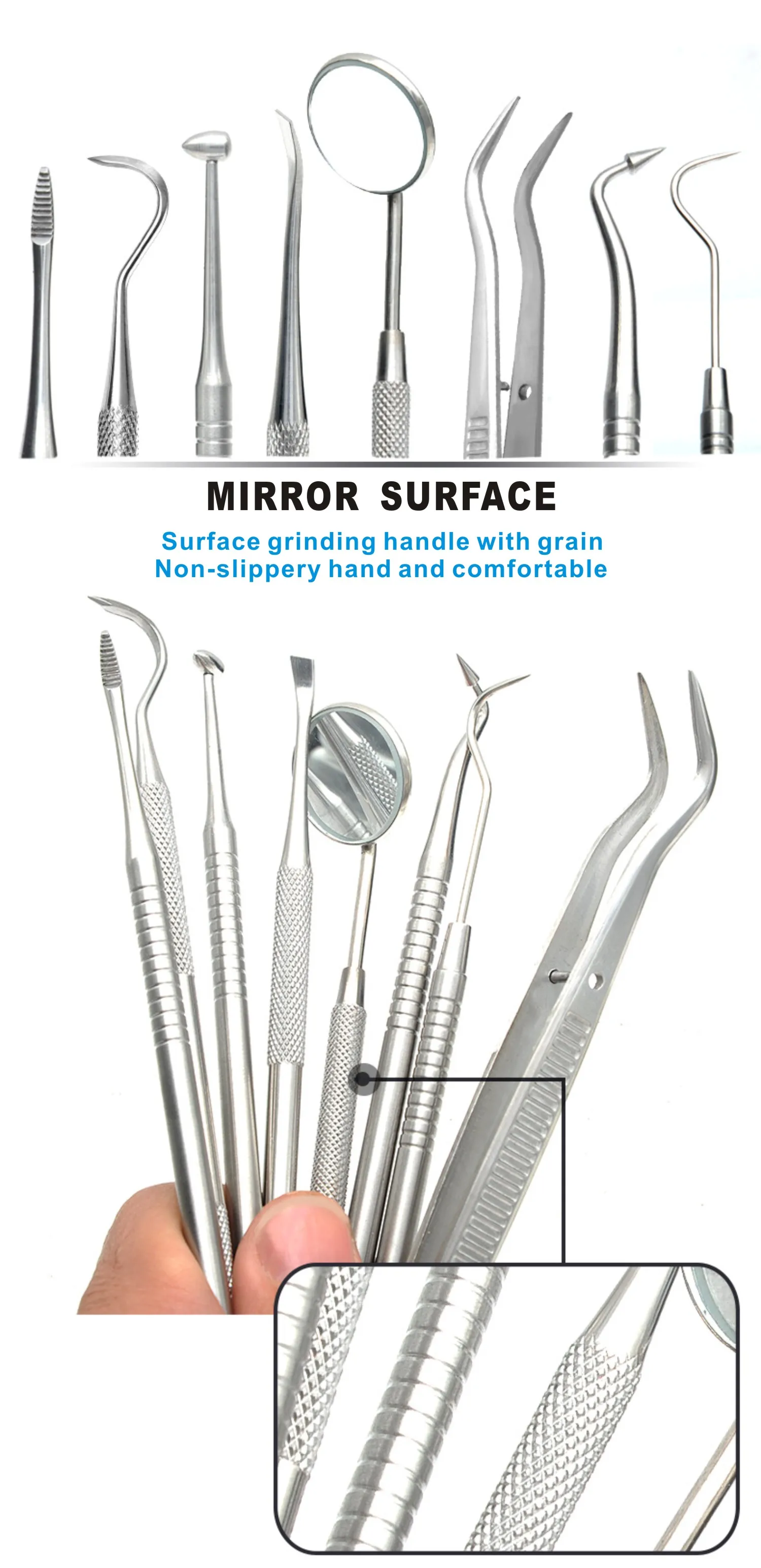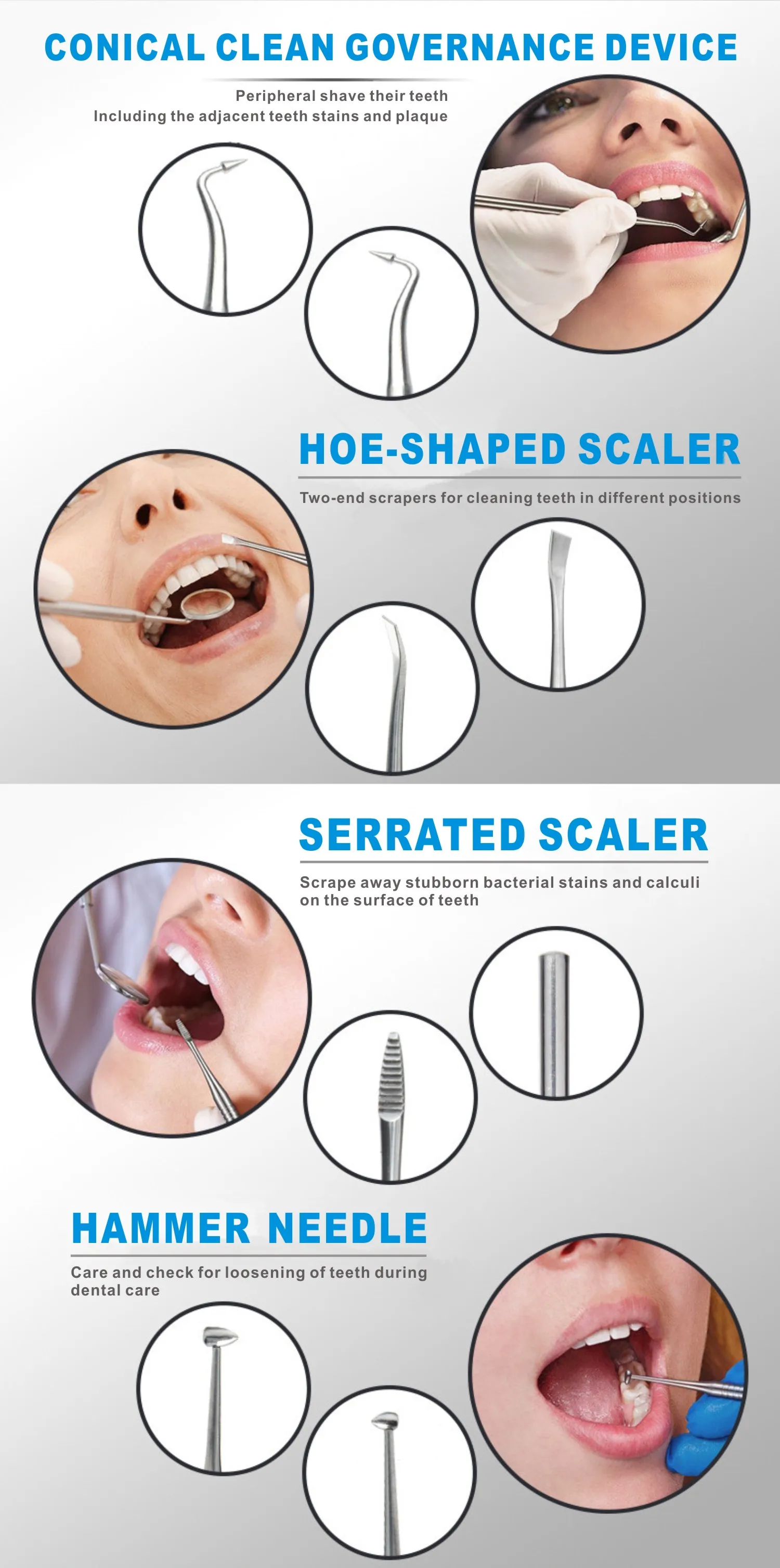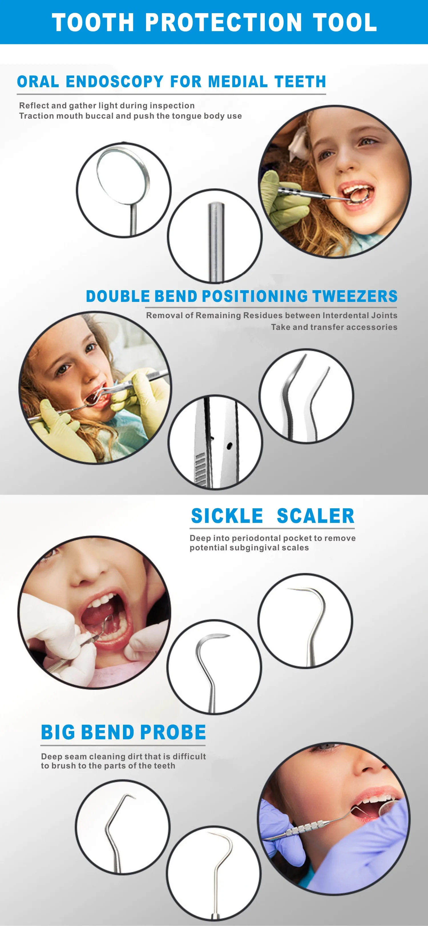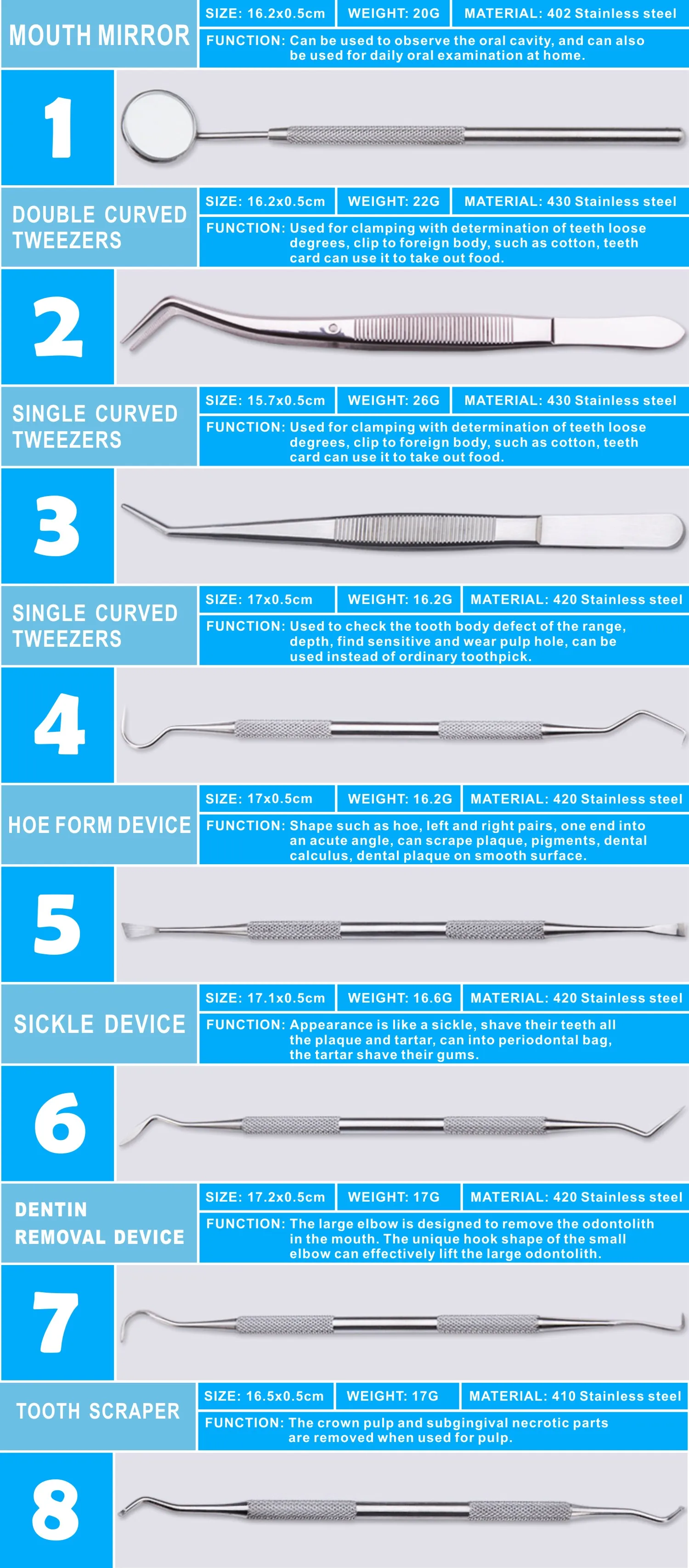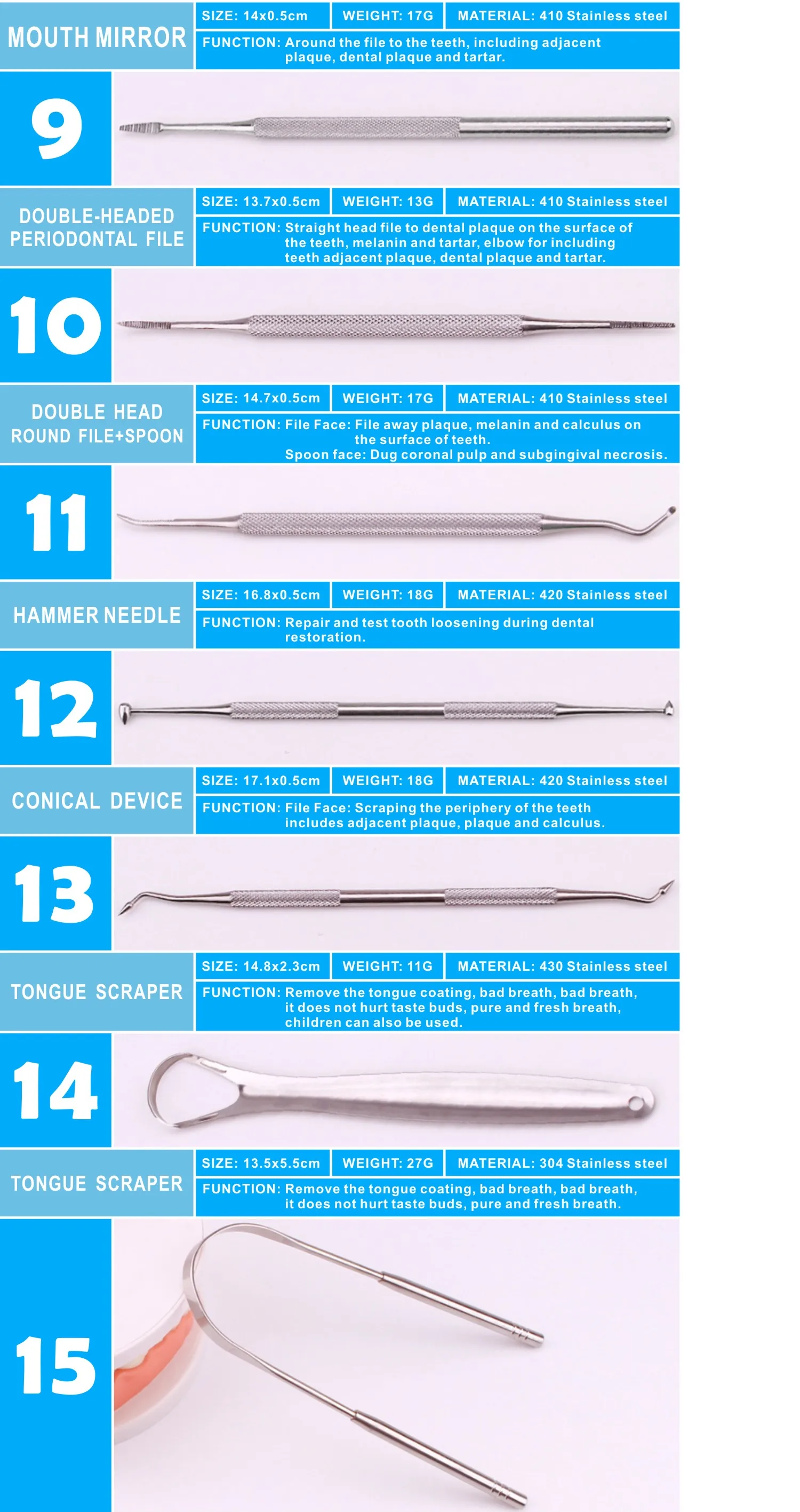 1.Includes tartar scraper, anti-fog mouth mirror, dental scaler, dental tooth pick.